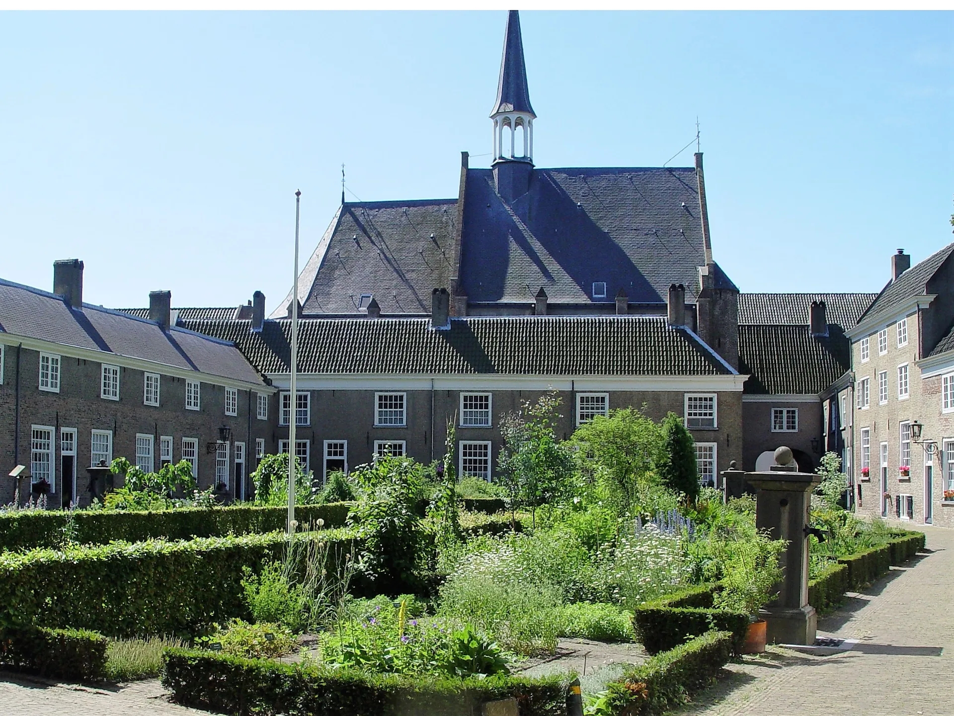 The Beguinage of Breda is a walled complex consisting of small houses and a small church in the city centre of Breda. The 29 houses, spread over two courtyards, are grouped around a herb garden containing around three hundred different herbs. There is also a statue of two beguines in conversation. It is located close to Park Valkenberg.