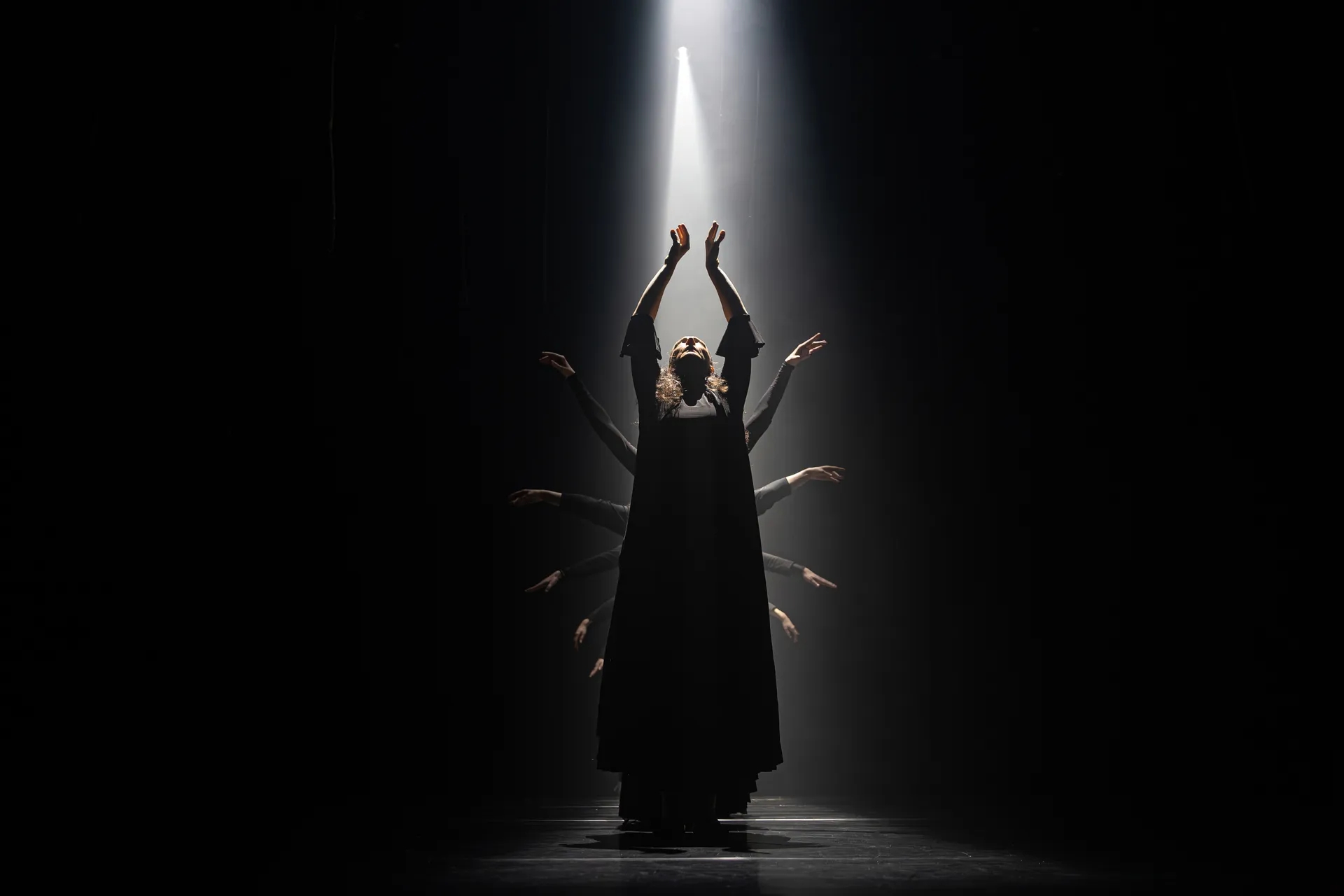 La Dame en Noir is a powerful total spectacle where dance, live percussion, singing, and visuals blend into one intense experience. Rhythms and sounds from various cultures take the audience on a journey beyond borders and time.