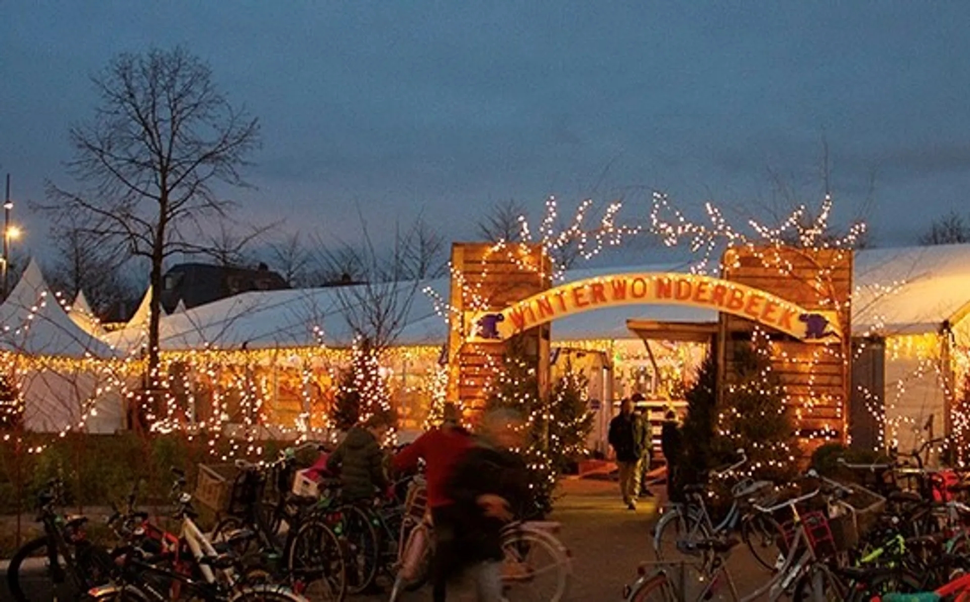 After sunset, WinterWonderBeek looks even more magical with festive lighting on the market in Prinsenbeek.